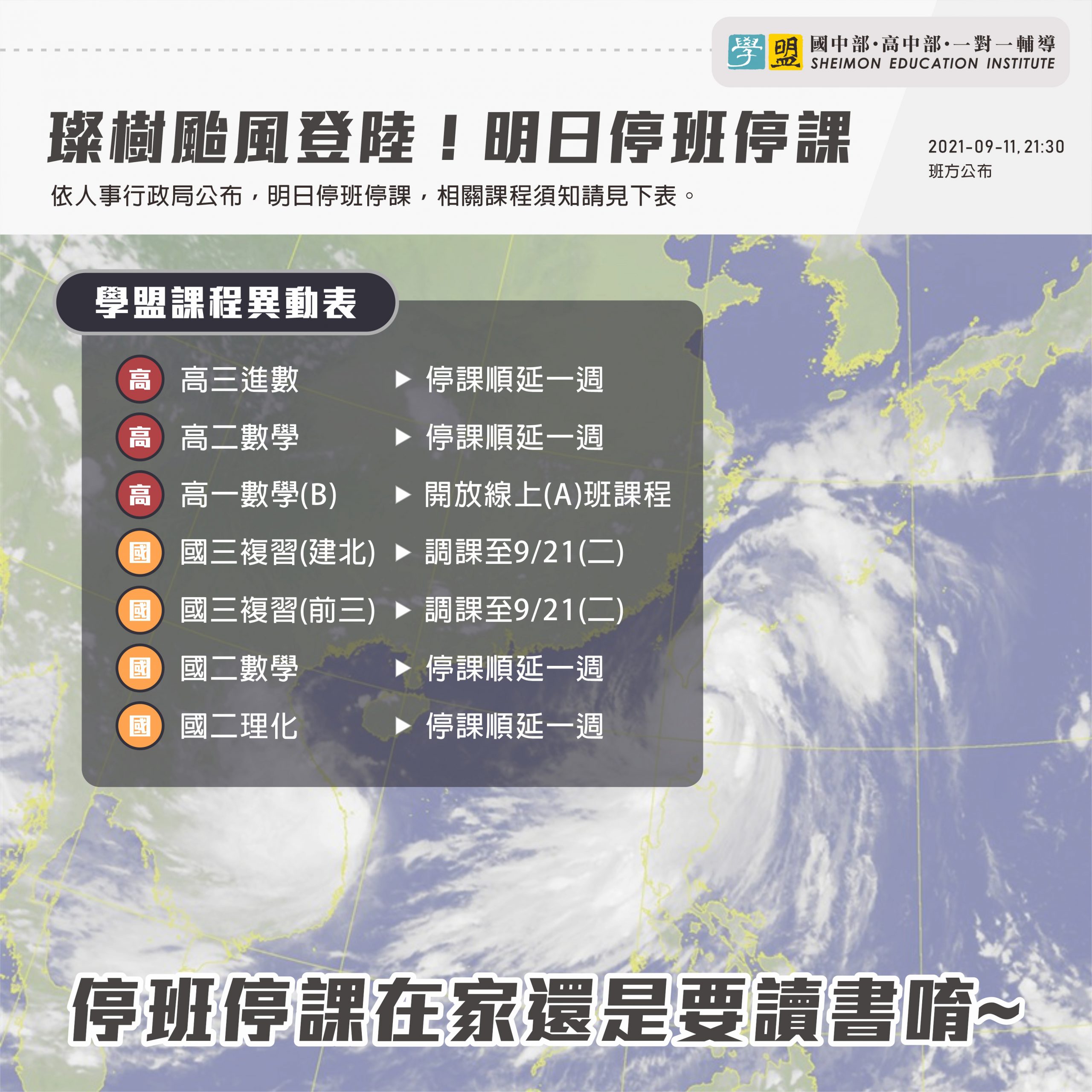2021-09-11 【颱風課程異動通知】 本班公告 【颱風課程異動通知】 READ MORE . 作者: 作者: sheimon02 分類: 最新公告, 本班公告 本班公告 【颱風課程異動通知】 READ MORE . 璨樹颱風來勢洶洶🌀🌀🌀 因配合人事行政局停課通知,明日9/12(日)全天課程暫停乙次 停課期間補習班不對外開放,電話將無人接聽 為了你我安全,有相關事務詢問,請多利用本班官方LINE@ 各科課程異動如下表👇 分類: 最新公告, 本班公告 下一篇文章 高一課程 上一篇文章 📣 高一新鮮人 看過來 🎉 相關文章 高二寒訓領先班 學盟Link Tree!社交媒體一次搞定! 113暑秋高三學測班 高二亞洲盃全國擬真模擬考