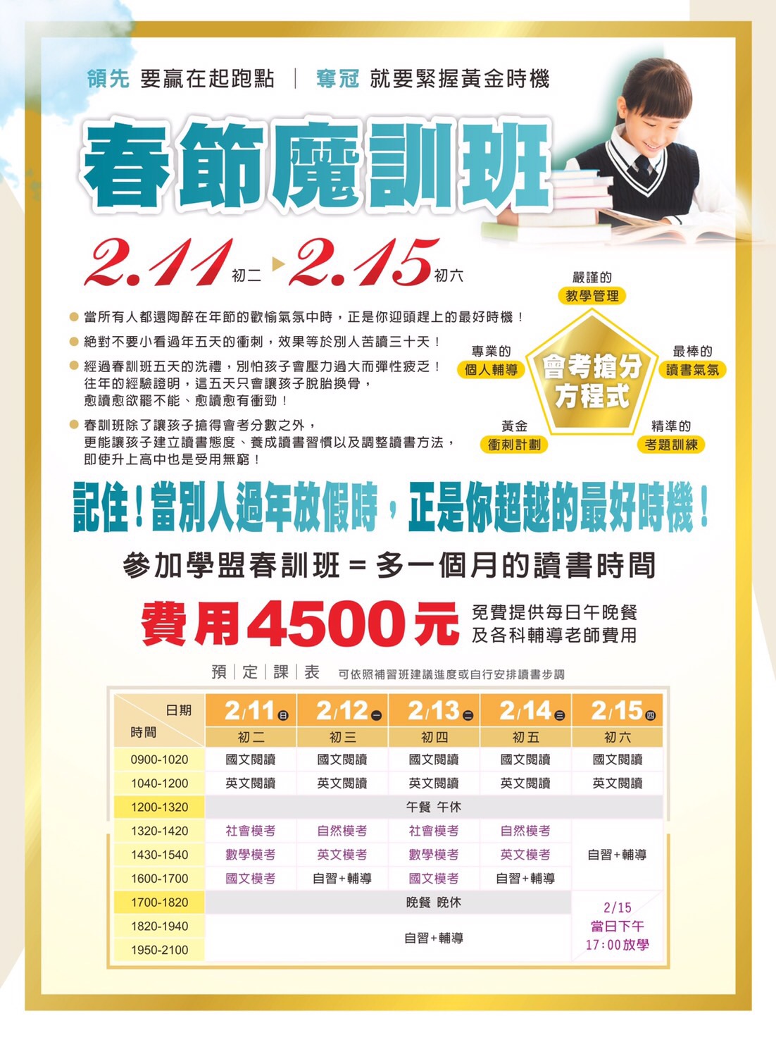 2021-11-17 9年級春訓班 作者: 作者: sheimon02 分類: 國中課程, 課程資訊 國中九年級 春訓班 2月起 分類: 國中課程, 課程資訊 下一篇文章 【學盟第二次段考停課時間表】 上一篇文章 【學測最後衝刺讀書營】 相關文章 8升9年級會考全科班 8年級寒訓 高三科考班 專屬一對一家教
